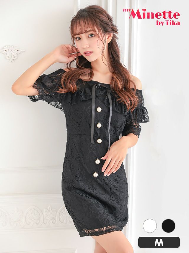 同伴にもおすすめ!オフショルで鎖骨をアピールできるブラックレースドレス