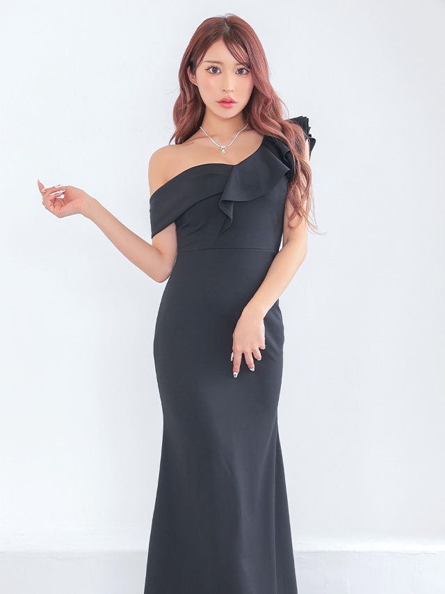 フリルデザインの黒ロングドレスは、甘さと大人っぽさを両立できるのが魅力。