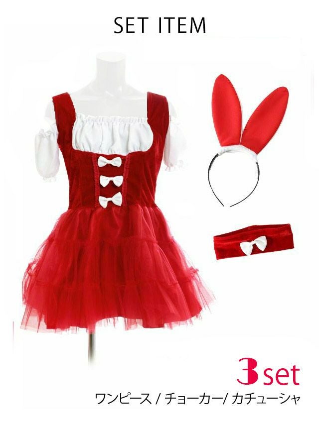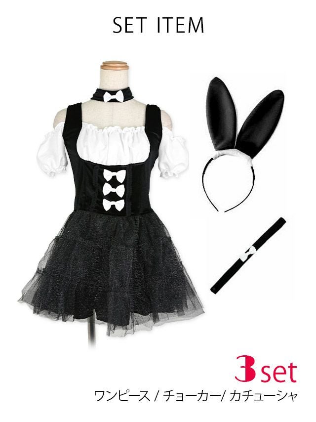 3. コスプレ リボン ふわふわチュール スカ―ト オフショル プチプラ ガーリー バニーガール [3点セット] (ワンピース/カチューシャ/チョーカー)(S~XL)