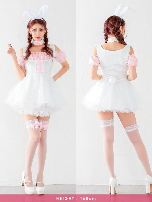 4. コスプレ リボン ふわふわチュール スカ―ト オフショル プチプラ ガーリー バニーガール [3点セット] (ワンピース/カチューシャ/チョーカー)(S~XL)
