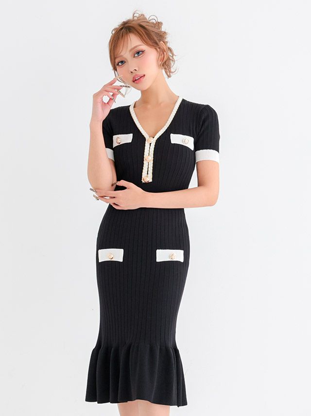 [新作]半袖 バイカラー配色 Vネック パールボタン付き マーメイド 膝丈ドレス(Mサイズ)(あん/キャバドレス着用)[myMinette/マイミネット]