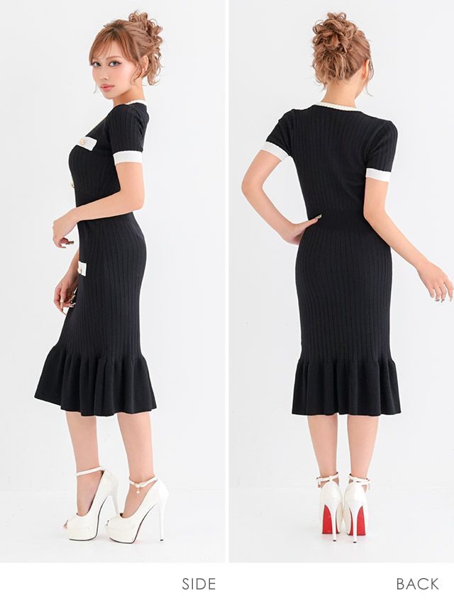 4. [新作]半袖 バイカラー配色 Vネック パールボタン付き マーメイド 膝丈ドレス(Mサイズ)(あん/キャバドレス着用)[myMinette/マイミネット]