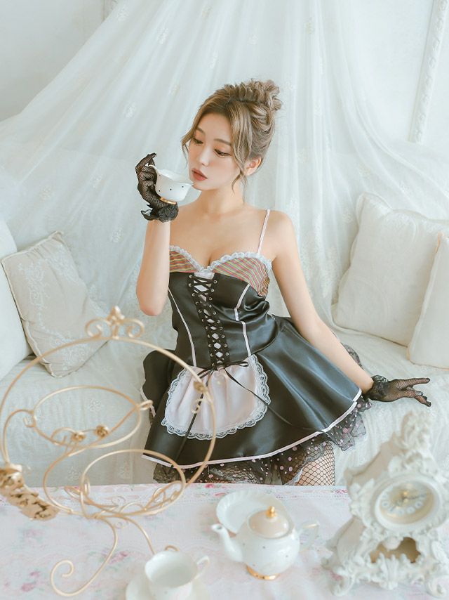 4. [ワケありセール] レースアップドットチュールアメリカンインポートセクシーウェイトレス [2点セット] (ワンピース/アームウォーマー)
