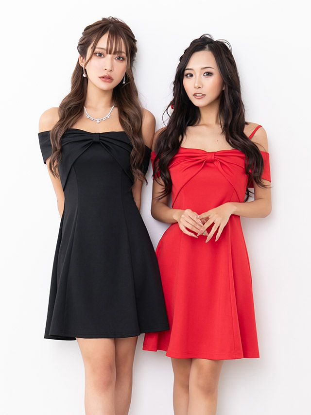 キャバドレス 安い 激安 ミニ丈 キャバクラ クラブ ラウンジ キャミソール 肩あき ガーリー バストリボン ワンカラー フレア ミニ ドレス プチプラドレス
