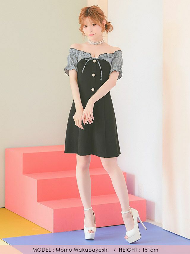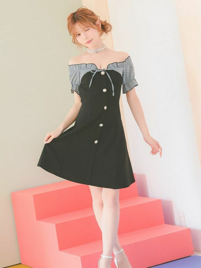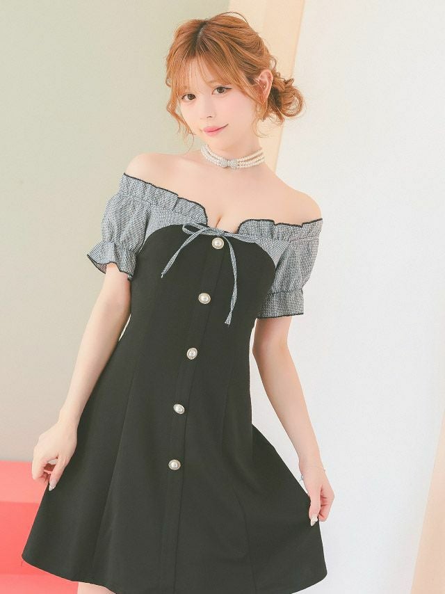 5. オフショルダー 千鳥格子柄 ネックリボン パフスリーブ フロントボタン フレアミニドレス (Sサイズ~XXLサイズ) (若林萌々/キャバドレス着用) [Tika/ティカ]