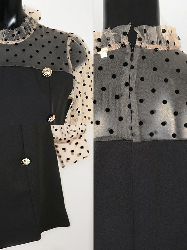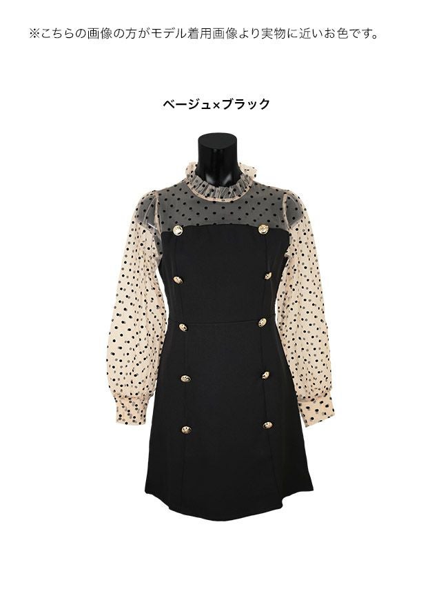 5. ドット柄 シースルー ゴールドボタン 長袖 袖あり パフスリーブ フレア ミニドレス (Sサイズ〜XLサイズ)(あおぽん/キャバドレス着用)[myMinette/マイミネット]