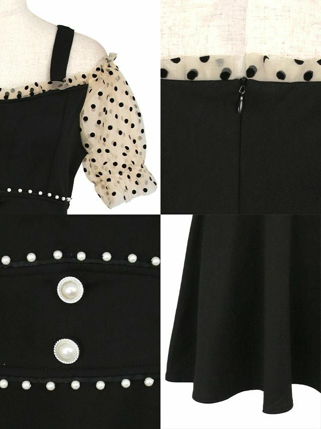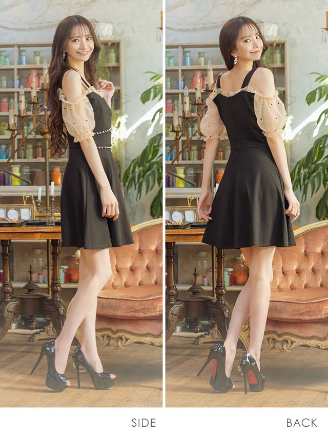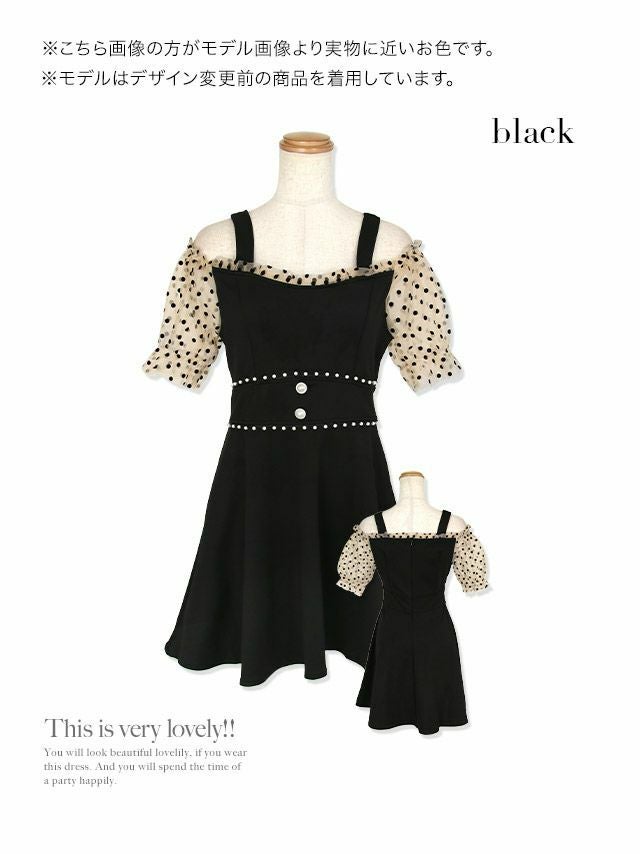 キャバドレス 安い 激安 ミニ丈 キャバクラ クラブ ラウンジ  シアー ドット柄 半袖 肩あき ハイウエスト切替 フレア ミニ ドレス プチプラドレス
