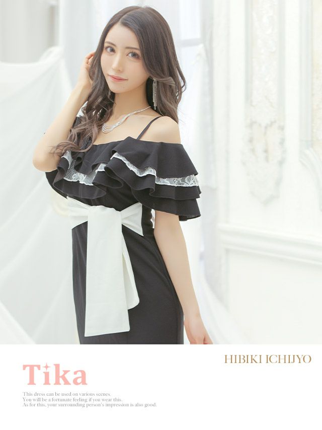 ティアード胸元フリルスリット肩あきタイトロングドレス (Sサイズ~XXLサイズ) (一条響/キャバドレス着用)