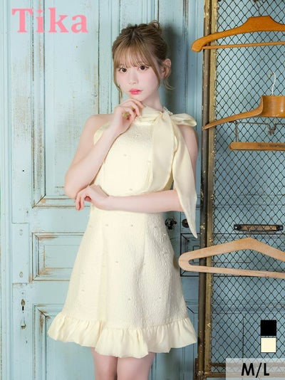 お顔周りを"ガーリー&可愛い"を格段にUP♡ ワンピース Aライン ミニドレス ノースリーブ 上品 ハイネック ネックリボン フラワービジュー パール 裾フリル (黒嵜菜々子着用) [Tika/ティカ]