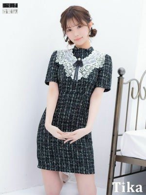 3. [アウトレット]ツイード チェック柄 半袖 ハイネック ケミカルレース ネックリボン タイトミニドレス (Sサイズ~XXLサイズ) (浦西ひかる/キャバドレス着用) [Tika/ティカ]