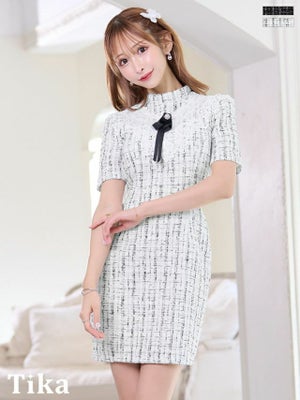 5. [アウトレット]ネックリボン フラワーレース 半袖 ツイード チェック柄 タイトミニドレス (Sサイズ~XXLサイズ) (聖菜/キャバドレス着用) [Tika/ティカ]