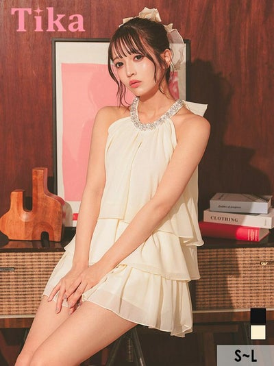 パーティーシーンにもおすすめ♡ ワンピース Aライン ミニドレス セットアップ 上品 ハイネック ホルターネック ネックビジュー バックリボン ビジュー ティアード フリル シフォン 同伴 (横田未来着用) [Tika/ティカ]
