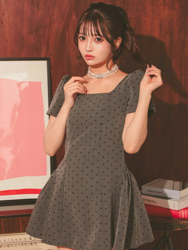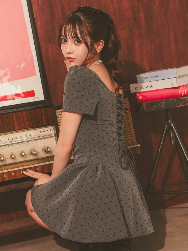3. ワンピース Aライン ミニドレス 上品 ドット柄 半袖 パフスリーブ バックレースアップ ブラジャーのまま (黒嵜菜々子着用) [Tika/ティカ]