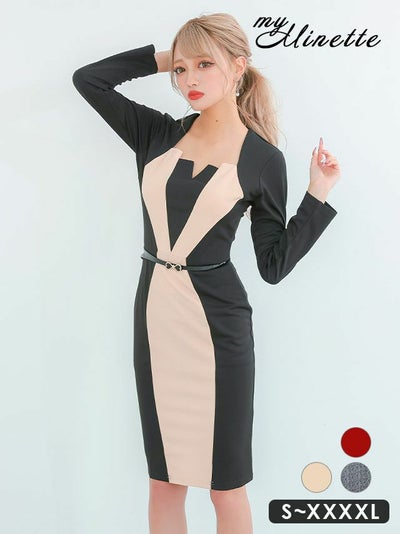 5. [SALE] 膝丈ドレス バイカラー ベルト付き タイト 長袖 プチプラ キャバドレス (林姫奈妙着用)[th-md5578b-sale]