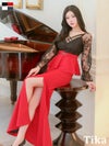 誘惑的なメリハリボディに♡ タイト ロングドレス 長袖 谷間 大きいサイズ レース 大人 スリット ストレッチ バイカラー ペプラム ウエストベルト クロスネック ベルスリーブ (黒嵜菜々子着用) [Tika/ティカ]