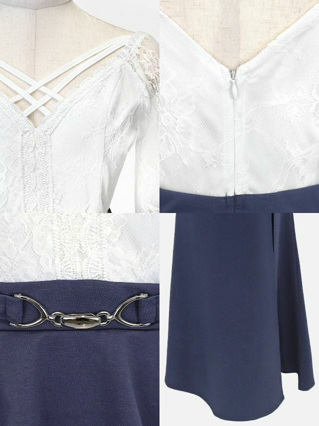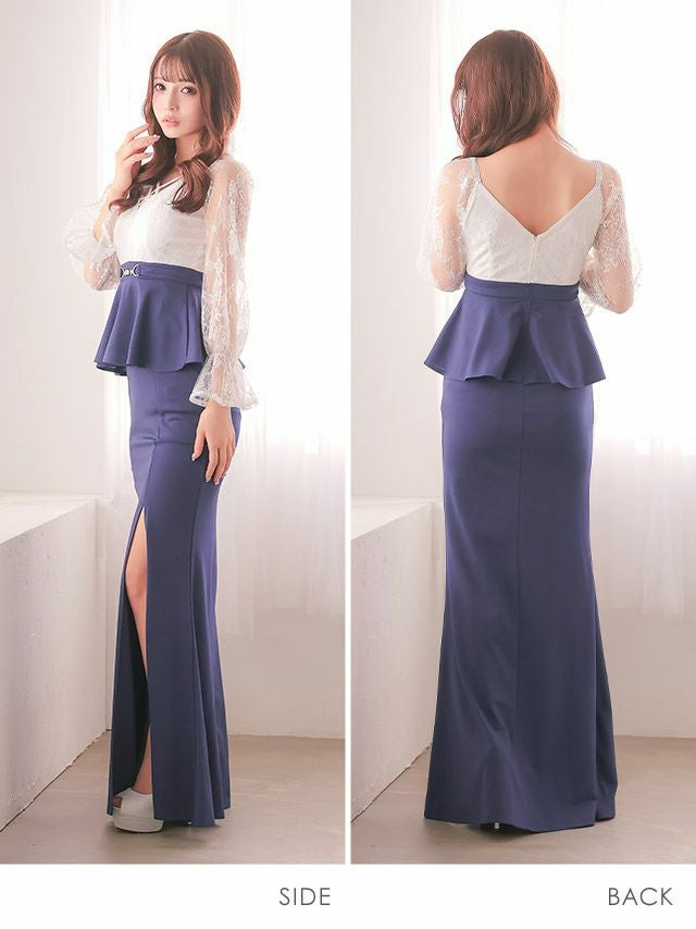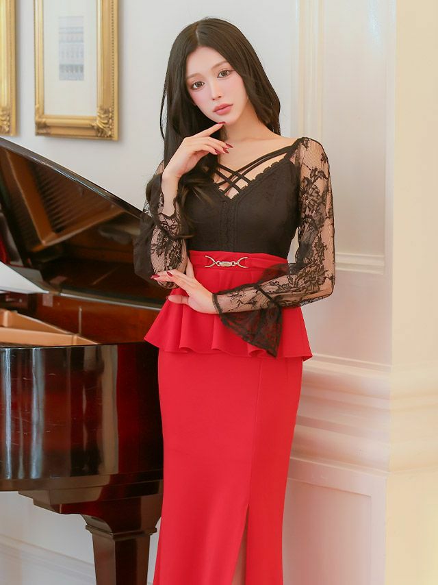 5. タイト ロングドレス 長袖 谷間 大きいサイズ レース 大人 スリット ストレッチ バイカラー ペプラム ウエストベルト クロスネック ベルスリーブ (黒嵜菜々子着用) [Tika/ティカ]