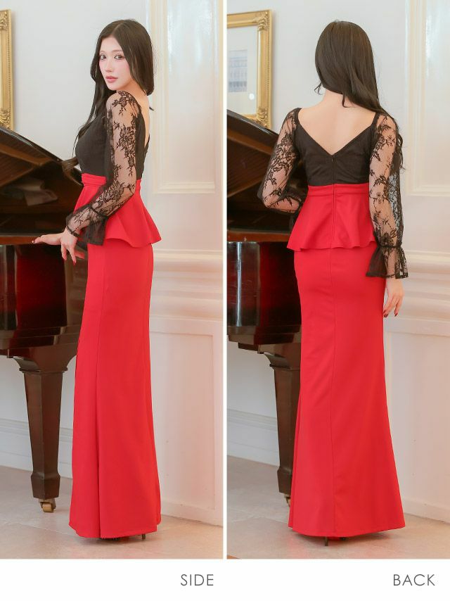 3. タイト ロングドレス 長袖 谷間 大きいサイズ レース 大人 スリット ストレッチ バイカラー ペプラム ウエストベルト クロスネック ベルスリーブ (黒嵜菜々子着用) [Tika/ティカ]