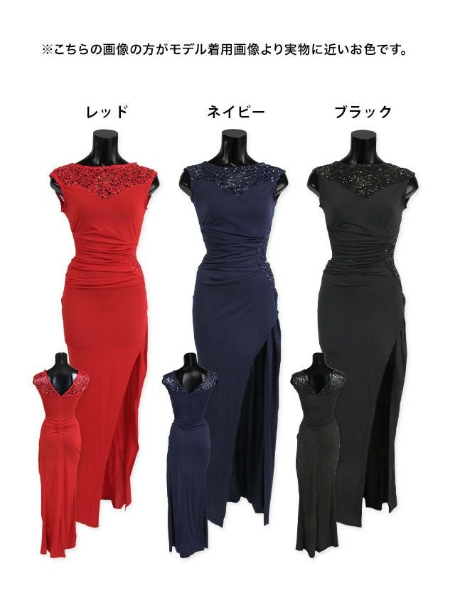 胸元スパンコールレースノースリーブプチプラタイトロングドレス