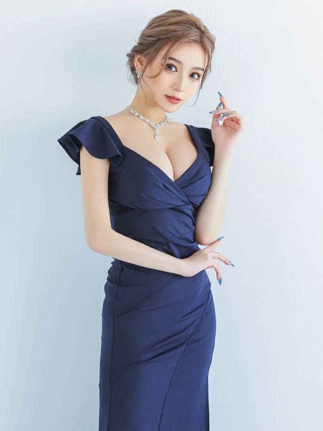 4. [SALE] ロングドレス プチプラ ギャル タイト スリット セクシー ラウンジ 半袖 谷間 背中魅せ ネイビー 高身長 キャバドレス (せいせい着用/S~Lサイズ対応) | myMinette/マイミネット