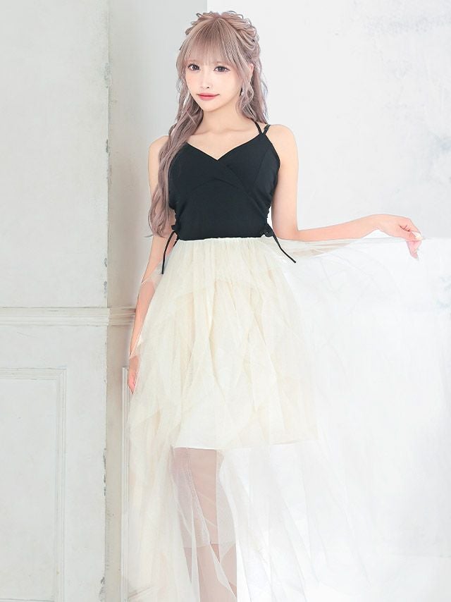キャバドレス 安い 激安 ミニ丈 キャバクラ クラブ ラウンジ チュール シアー ウエスト リボン バック クロス キャミソール Aライ ンロング ドレス プチプラ ドレス