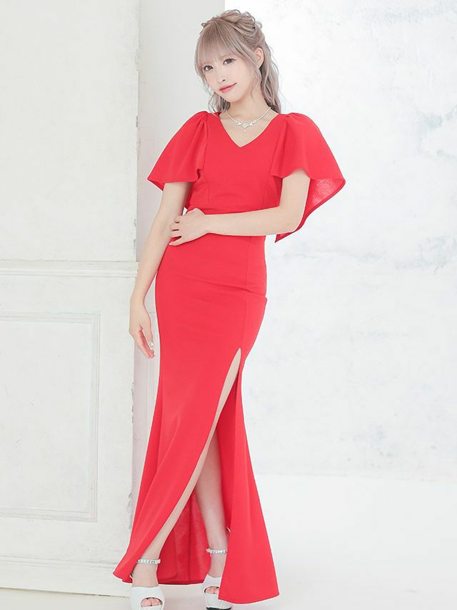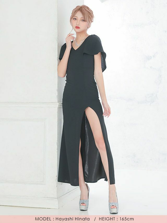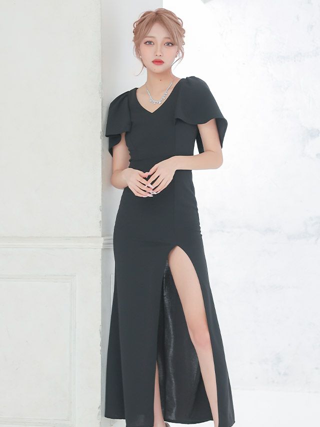 5. [SALE]ワンカラーフリル袖スリット入りプチプラ半袖Aラインロングドレス (Sサイズ~Lサイズ)(林姫奈妙/キャバドレス着用)[myMinette/マイミネット]