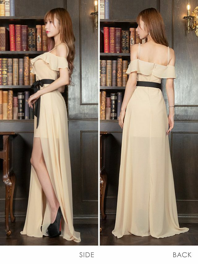 4. 肩あき 胸元フリル ブラックリボンベルト シフォン Aラインロングドレス (Sサイズ~XXXLサイズ) (まぁみ/キャバドレス着用) [Tika/ティカ]