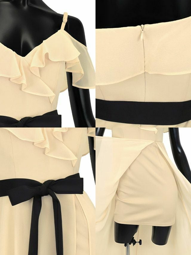肩あき胸元フリルブラックリボンベルトシフォンAラインロングドレスのディティール1枚目
