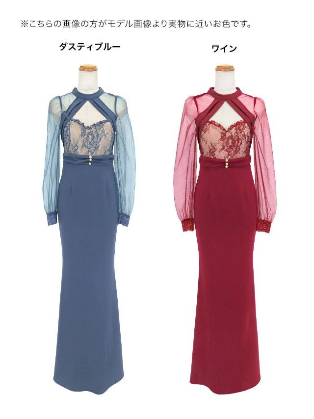 シアースリーブ長袖バストカットヌーディーレースバックスリットストレッチタイトロングドレス