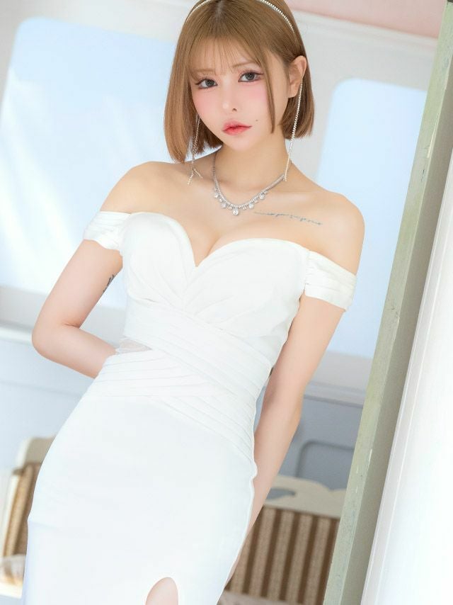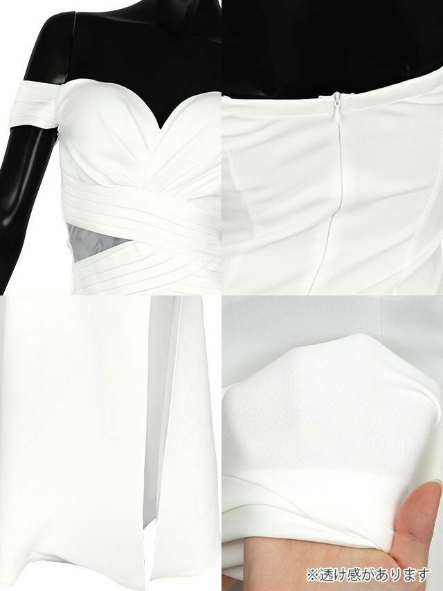 4. バストハートカット ギャザー シアーカットアウト オフショルダー ワンカラー スリット タイトロングドレス (Sサイズ~XLサイズ) (戦慄かなの/キャバドレス着用) [Tika/ティカ]