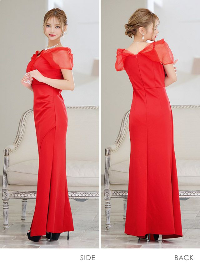 肩あきボリュームチュールスリーブワンカラーストレッチスリットタイトロングドレスのサイドバック