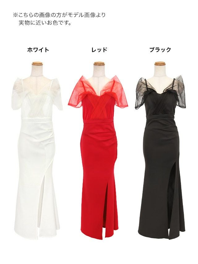 肩あきボリュームチュールスリーブワンカラーストレッチスリットタイトロングドレスのカラー