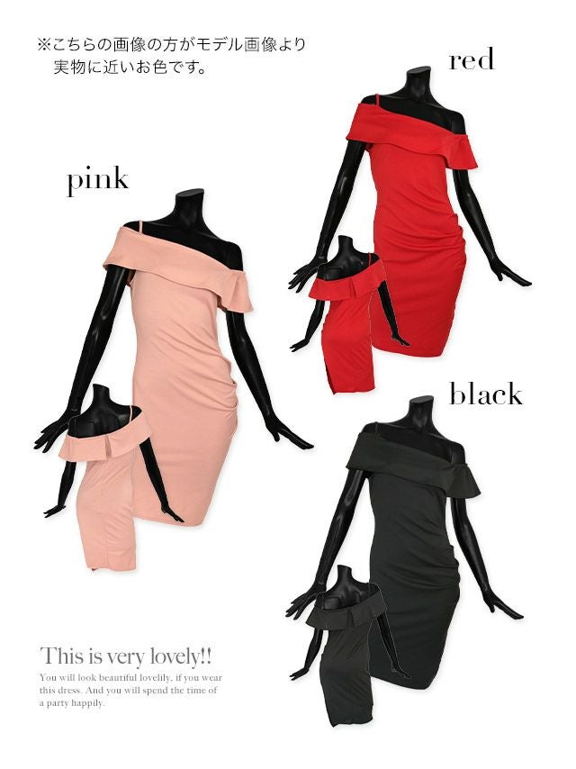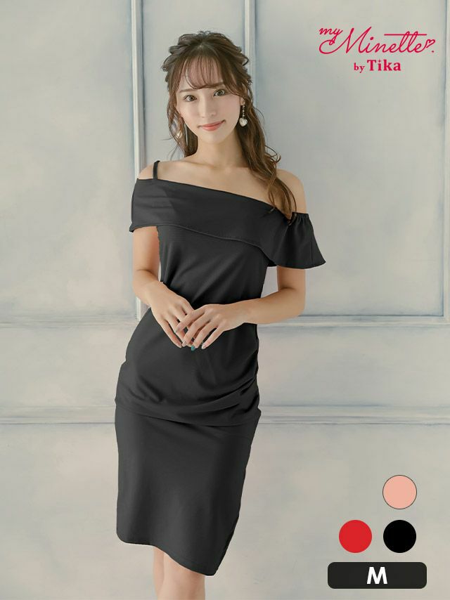 3. [SALE]ワンカラーワンショルダー胸元フリルタイトプチプラオフショルダー膝丈ドレス (Mサイズ)(中尾みほ/キャバドレス着用)[myMinette/マイミネット]