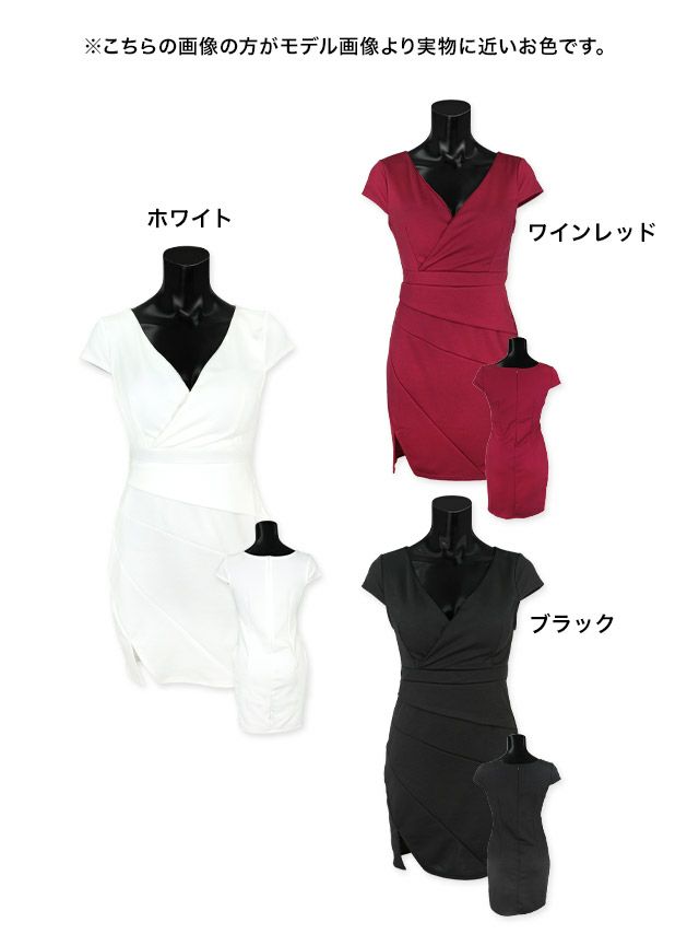 4. [SALE]スリット入りギャザーデザイン半袖カシュクールプチプラタイトミニドレス (Sサイズ~Lサイズ)(向葵まる/キャバドレス着用)[myMinette/マイミネット]