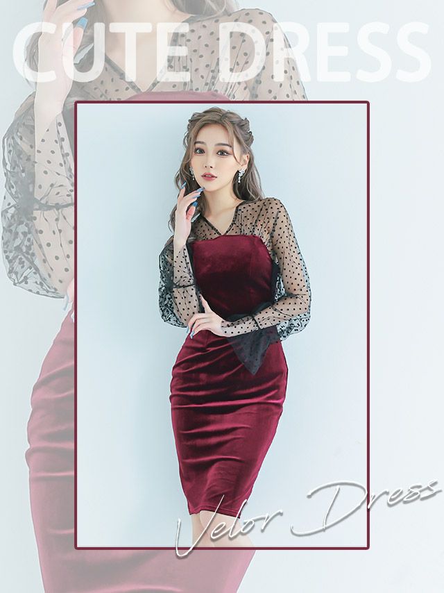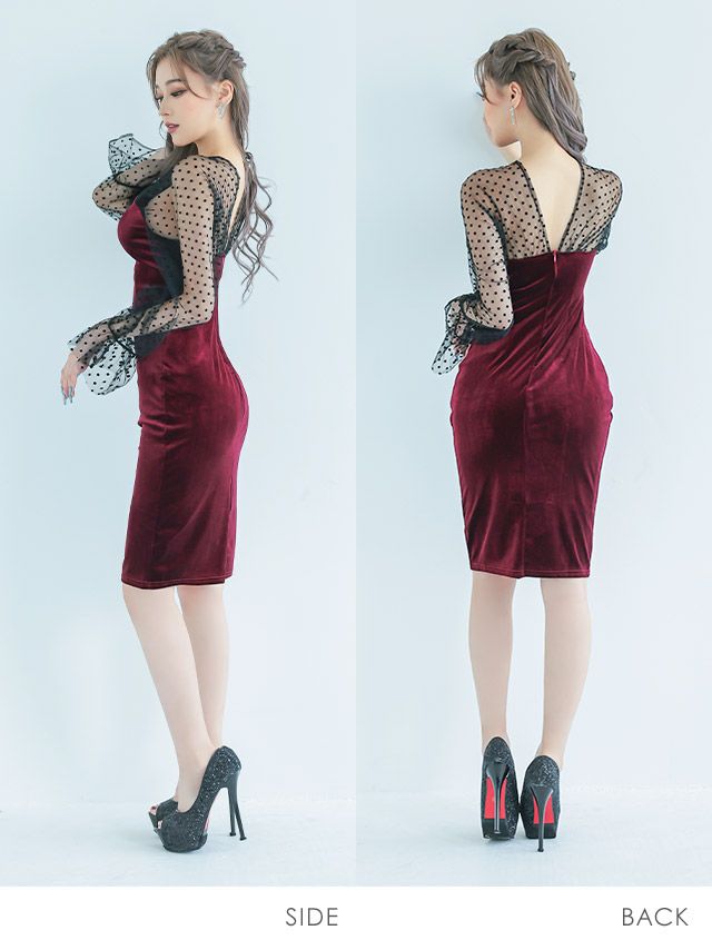 キャバドレス 安い 激安 ミニ丈 キャバクラ クラブ ラウンジ シースルー ドット 柄 長袖 タイト プチプラ 膝丈 ドレス プチプラ ドレス