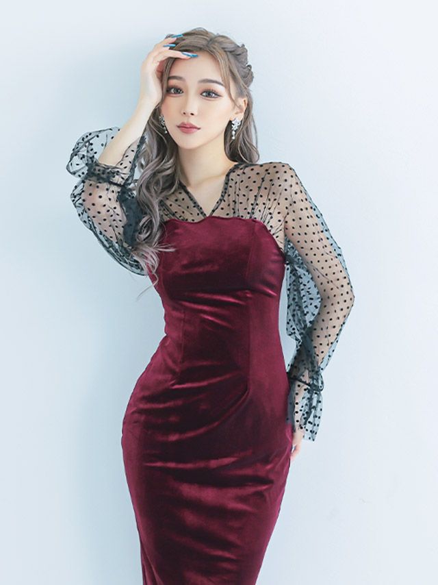 キャバドレス 安い 激安 ミニ丈 キャバクラ クラブ ラウンジ ベロア ドット 柄 シースルー フレア 長袖 タイト プチプラ 膝丈 ドレス プチプラ ドレス