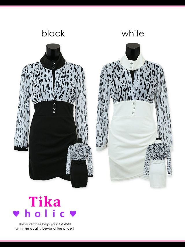 ハイネックシースルーレオパード柄モノトーンタイトミニドレス