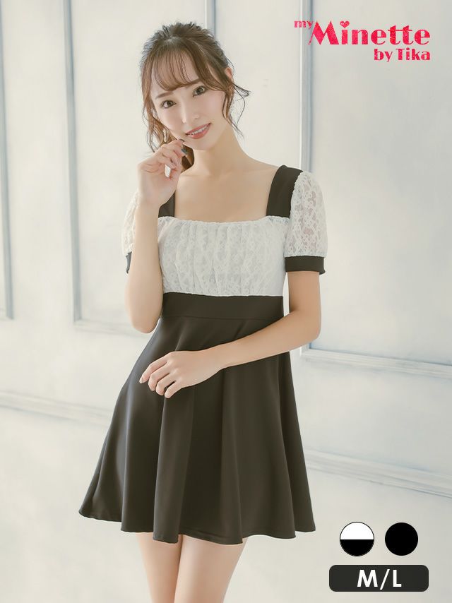 [SALE]パフスリーブ半袖レース切替モノトーンガーリープチプラフレアミニドレス (Mサイズ~Lサイズ)(中尾みほ/キャバドレス着用)[myMinette/マイミネット]