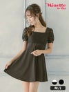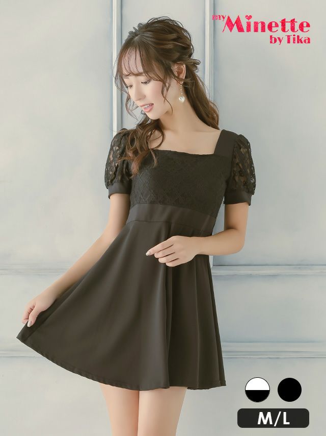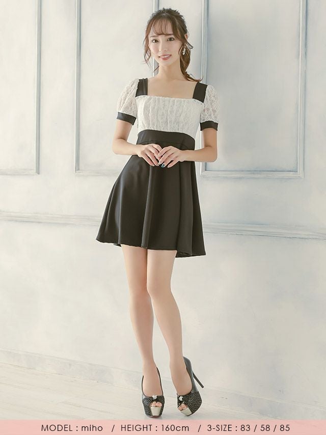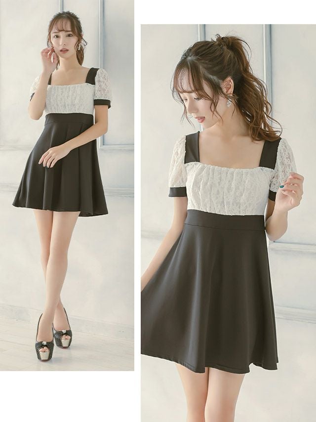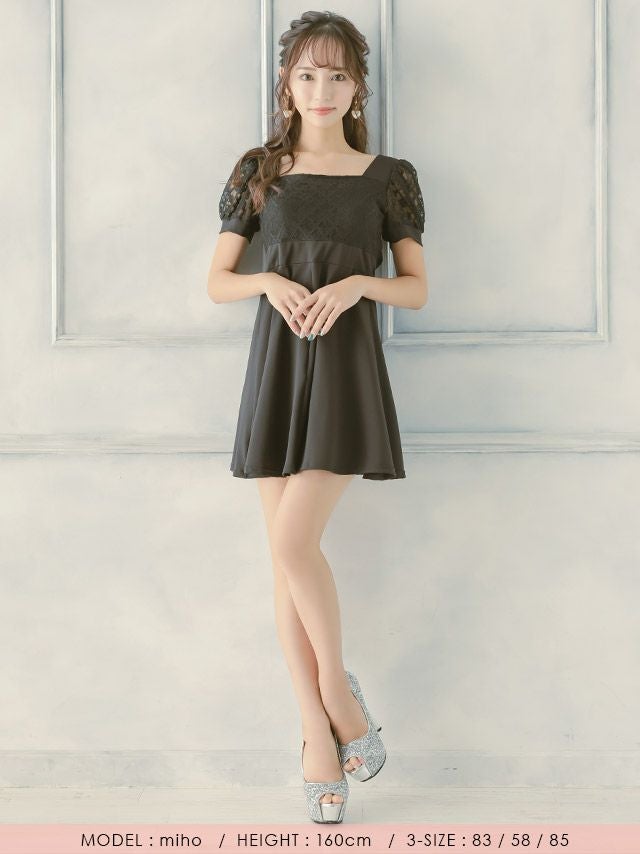 [SALE]スクエアネック袖ありレースプチプラ半袖フレアミニドレス (Mサイズ~Lサイズ)(中尾みほ/キャバドレス着用)[myMinette/マイミネット]