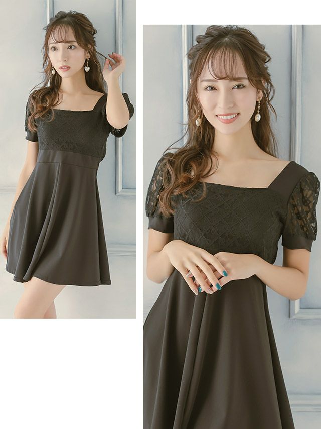 キャバドレス 安い 激安 ミニ丈 キャバクラ クラブ ラウンジ スクエアネック 袖あり レース Aライン ミニドレス プチプラドレス