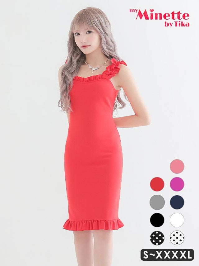 [SALE]ノースリーブフリルデザインノースリーブタイトプチプラ膝丈ドレス(Sサイズ~XXXXLサイズ)(なぎ/キャバドレス着用)[myMinette/マイミネット]