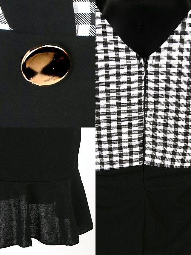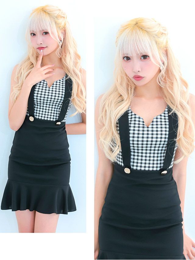 5. [SALE]サスペンダー風Vネックチェック柄マーメイド裾フリルプチプラタイトミニドレス (Sサイズ~XLサイズ)(向葵まる/キャバドレス着用)[myMinette/マイミネット]