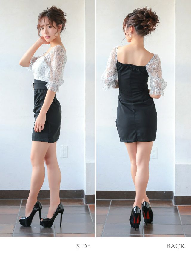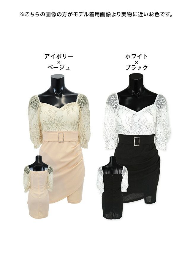 キャバドレス 安い 激安 ミニ丈 キャバクラ クラブ ラウンジ バイカラー ハート デザイン カット レース ウエスト ベルト パフスリーブ プチプラ タイト ミニ ドレス プチプラ ドレス