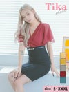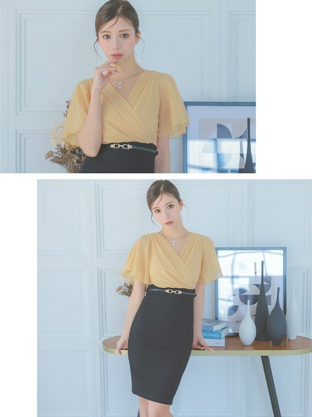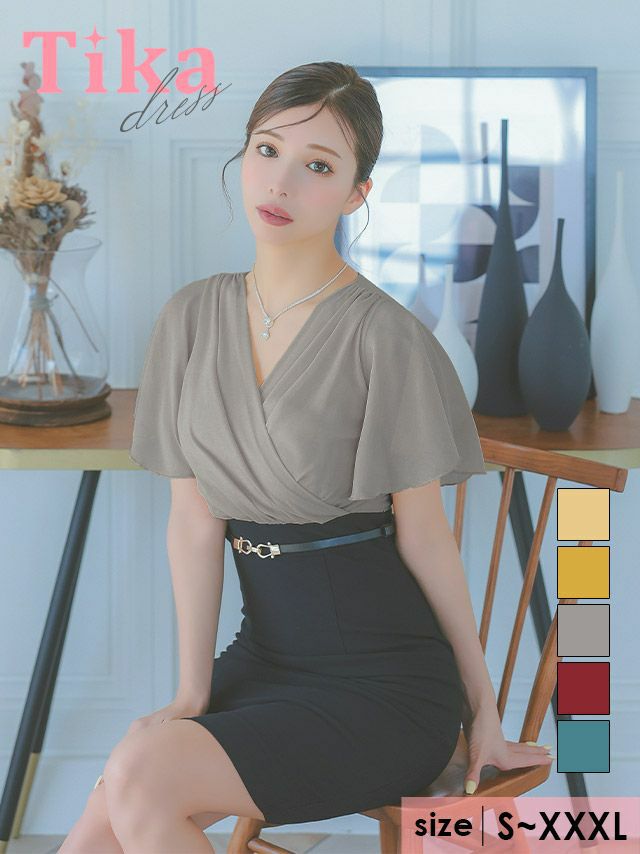 5. [アウトレット] 半袖カシュクールシフォンウエストベルトタイト膝丈ドレス (Sサイズ~XXXLサイズ) (みゆう/キャバドレス着用) [Tika/ティカ]