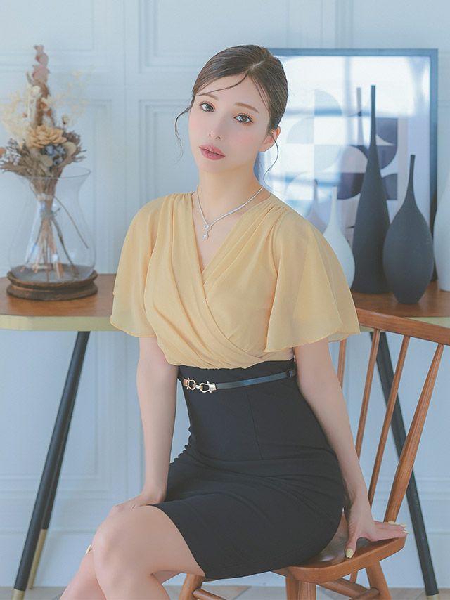 キャバドレス 安い 激安 ミニ丈 キャバクラ クラブ ラウンジ 半袖 カシュクール シフォン ウエスト ベルト タイト 膝丈 ドレス プチプラドレス