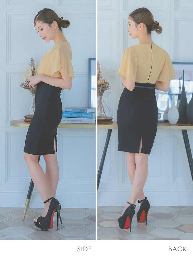 半袖カシュクールシフォンウエストベルトタイト膝丈ドレスのサイドバック