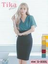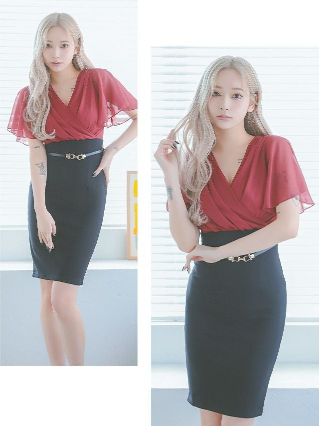 [アウトレット] 半袖カシュクールシフォンウエストベルトタイト膝丈ドレス (Sサイズ~XXXLサイズ) (みゆう/キャバドレス着用) [Tika/ティカ]
