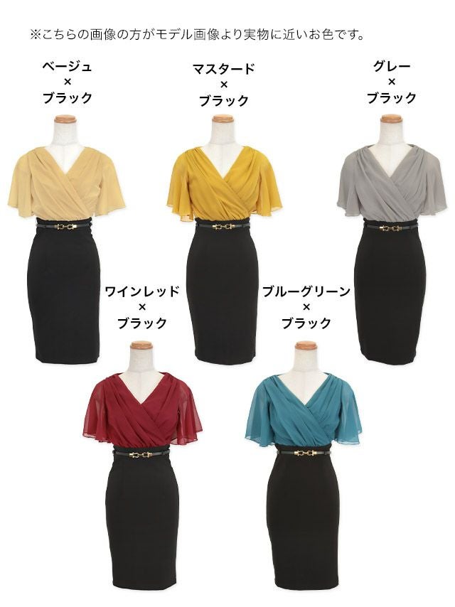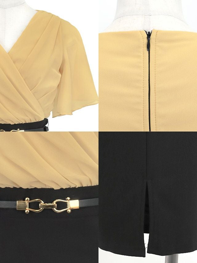 半袖カシュクールシフォンウエストベルトタイト膝丈ドレスの商品画像1枚目