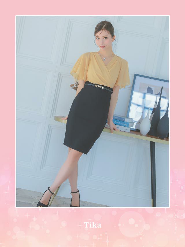 半袖カシュクールシフォンウエストベルトタイト膝丈ドレス (Sサイズ~XXXLサイズ) (みゆう/キャバドレス着用)[Tika/ティカ]