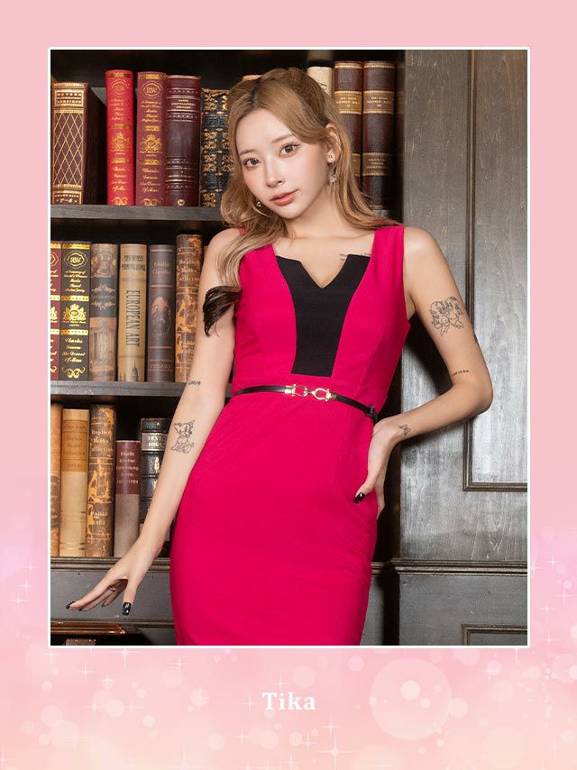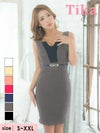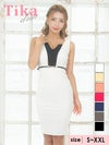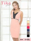 ノースリーブウエストベルトバイカラータイト膝丈ドレス (Sサイズ~XXLサイズ) (久保七瀬/キャバドレス着用) [Tika/ティカ]