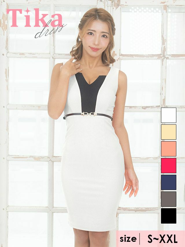 5. ノースリーブウエストベルトバイカラータイト膝丈ドレス (Sサイズ~XXLサイズ) (久保七瀬/キャバドレス着用)[Tika/ティカ]